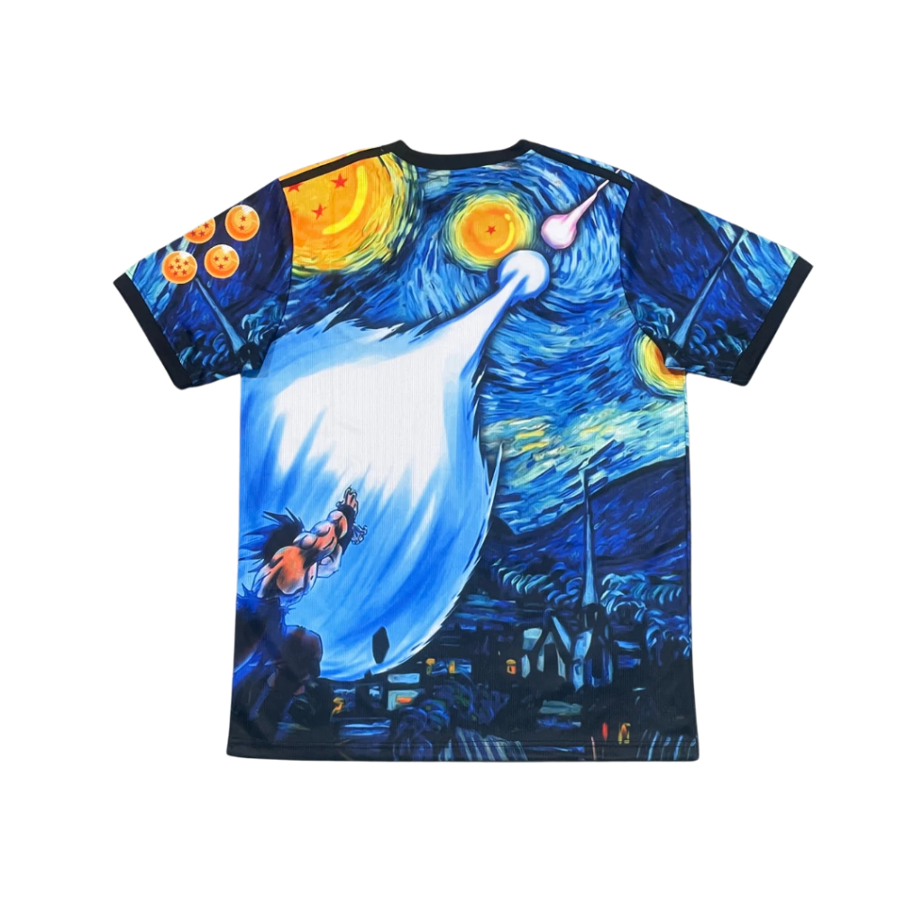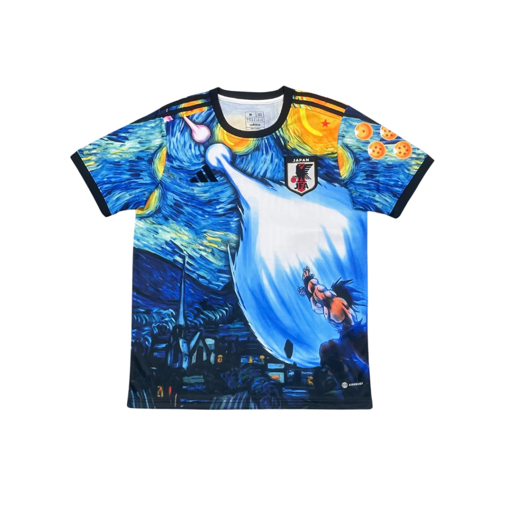 Entre no campo com uma fusão épica de arte, cultura pop e paixão pelo futebol! A camisa "Kamehana Noite Estrelada" homenageia a seleção japonesa com um design único: um cenário inspirado na obra-prima de Van Gogh combinado com a energia de um famoso guerreiro saiyajin.